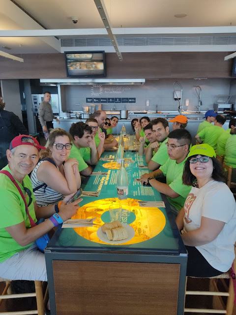 Un cop acabada l'activitat vàrem anar a l'espai del peix a dinar, allà ens esperava un deliciós àpat: coca de recapte, peix i fideuà! De postres pastís de pastanaga!